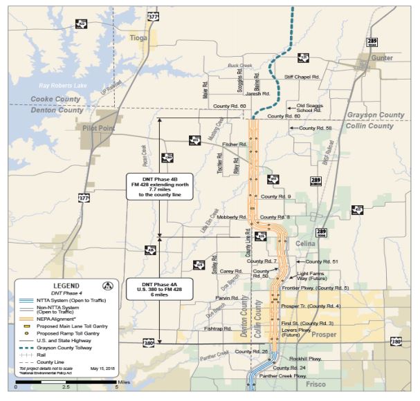 The Phase 4A extension is a 6-mile section from U.S. 380 to FM 428. The FY2018-FY2022 Capital Plan includes $350 million for planning, design and construction of 6 main-lanes. Total project costs are estimated at $350 million.